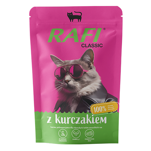 Karma Rafi Classic z kurczakiem zawiera odpowiednią ilość składników mineralnych i witamin, w pełni pokrywając zapotrzebowanie żywieniowe dorosłych kotów. Dzięki starannie opracowanej metodzie produkcji karma cechuje się wysoką smakowitością, co sprawia, że jest chętnie spożywana przez zwierzęta. Dodatek tauryny w karmie spełnia kluczowy wymóg żywieniowy, wspomagając prawidłowy proces trawienia tłuszczów i białek. Regularne podawanie karmy Rafi Classic w zalecanych ilościach nie zwiększa ryzyka nadwagi ani otyłości u kotów.