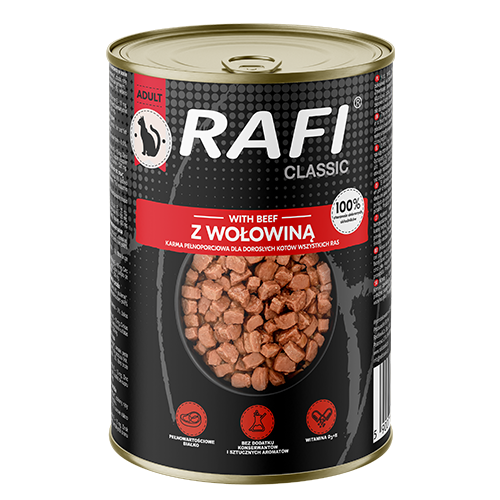 Karmy Rafi Cat to pełnoporcjowe karmy dla dorosłych kotów, które posiadają odpowiednio skomponowany skład spełniający ich wszystkie specyficzne wymagania żywieniowe. Najważniejszymi ich walorami są podstawowe surowce: mięso i produkty pochodzenia zwierzęcego oraz ryby i produkty rybne, które są źródłem wysokiej jakości białka. Karmy są produktami o optymalnej zawartości tłuszczu będącego źródłem naturalnie występującego w mięsie i produktach pochodzenia zwierzęcego kwasu arachidonowego – niezbędnego do prawidłowego funkcjonowania organizmu kotów. Dodatkowo surowce mięsne są naturalnymi źródłami kwasów z rodziny n-6, a dodatek do karm tauryny pokrywa fizjologiczną normę, dzięki czemu proces trawienia tłuszczu i białek zachodzi w sposób prawidłowy. Odpowiedni stosunek wapnia do fosforu przyczynia się do utrzymania prawidłowej homeostazy tych pierwiastków w organizmie i zachowania mineralizacji kości na stałym poziomie.
